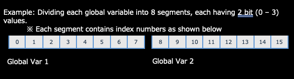 Merges a maximum of 16 global variables and creates a virtual 1-dimentional array. Also, individual global variables can be divided into smaller segments which allows more array elements to be used, by sacrificing the storage amount that can be used in each array element. This array division settings can be configured in the [Individual Array Element Bit Size] property. The maximum array size according to the bit size is as follows. <1 bit> = 256, <2 bit> = 128, <4 bit> = 64, <8 bit> = 32, <16 bit> = 16.
