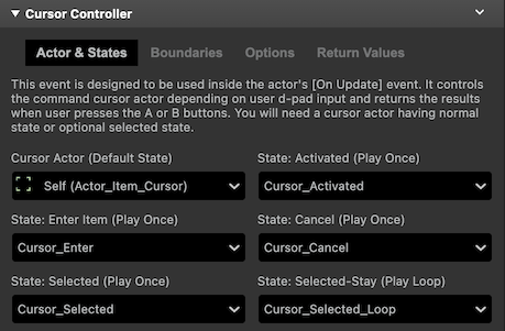 The [Actor & States] tab lets you specify the default actor to be used as the selection cursor. You can also set different animation states of the same actor sprite that automatically changes depending on the selected action (move, accept, cancel, etc).