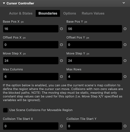 When this option is enabled, the map collisions of the current scene are used to define the region in which the cursor can move. Paths with non-zero collision values will be blocked. You can also use top/bottom/left/right collisions to allow the cursor to move in one-way direction. You can also use the ladder collision type to "jump" or skip the cursor to the next non-collision tile. Note: The movement step must be constant (i.e., Move Step X/Y specified as variables will be ignored).